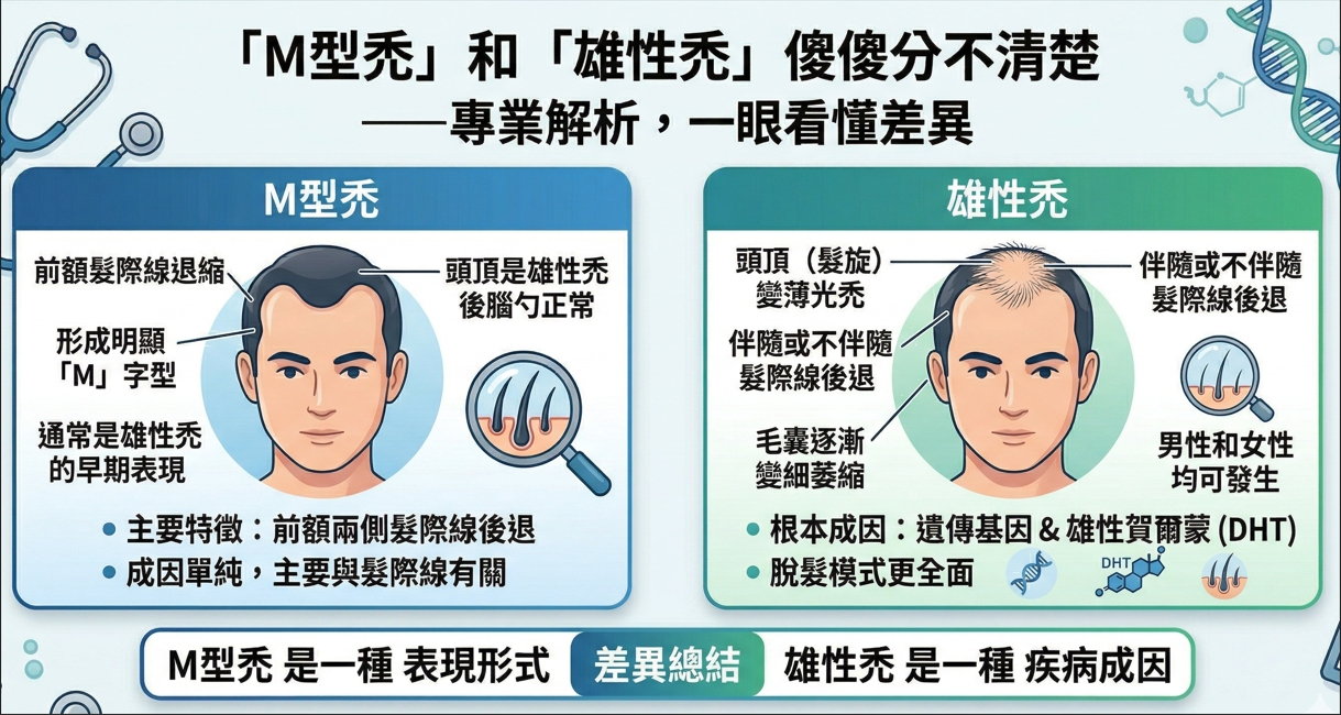 專業總結差異: 雄性禿是「疾病」,M型禿是「症狀」。這就像是「感冒」會流鼻水一樣;「雄性禿」發作時,最常出現的外觀就是「M型禿」。只要確認是雄性禿引起的 M 型禿,就必須及早針對毛囊進行根本性的治療。