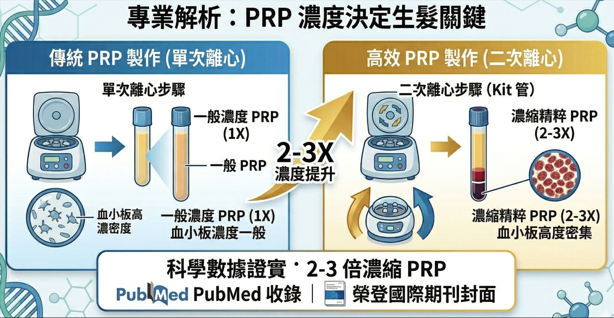 期刊結論:二次離心技術(Double-spin)能萃取出更高濃度的生長因子,其臨床生髮效果穩定度顯著優於傳統單次離心 。