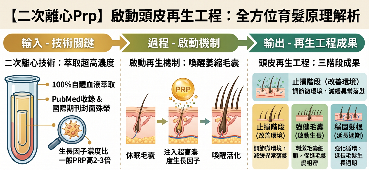 - 2-3 倍超高濃度:經科學數據證實,二次離心技術萃取出的濃度比傳統 PRP 高出 2-3 倍,這是成功驅動毛髮再生的關鍵 。