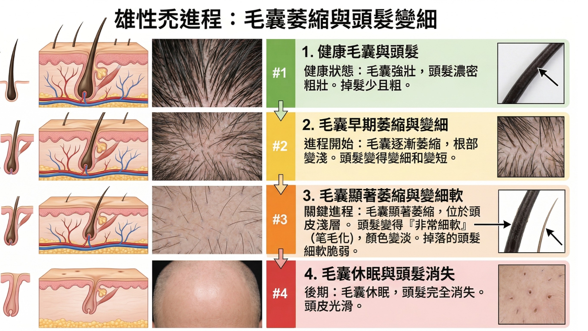 治療雄性禿的第一步,是透過高階頭皮毛囊檢測儀進行精準評估。雄性禿的進程會導致毛囊逐漸「萎縮變細」,患者會發現掉落的頭髮變得非常細軟。