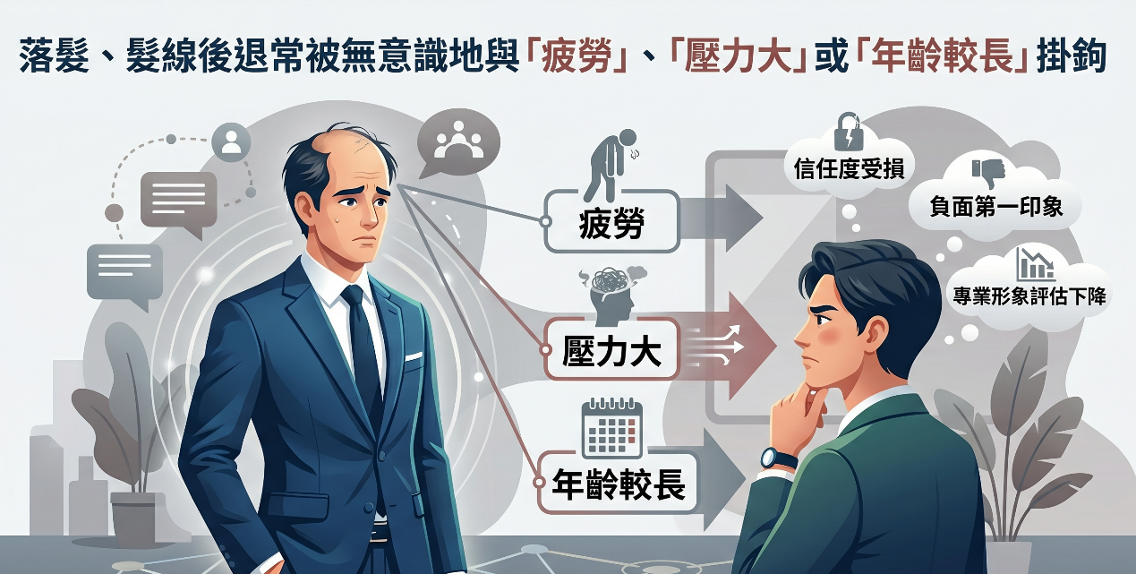 - 首因效應與視覺年齡的誤判: 在面試的黃金時間內,面試官對求職者的第一印象往往決定了後續面談的基調。落髮、髮線後退常被無意識地與「疲勞」、「壓力大」或「年齡較長」掛鉤。同年齡的求職者,髮量稀疏者在視覺上可能顯老。在講求活力、創新或需要高度精力的職位中,這種「視覺老化」常被誤解為體力不足,成為一個隱形的負面標籤。