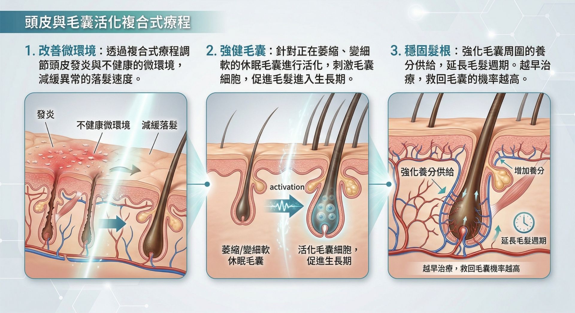 - 穩固髮根: 強化毛囊周圍的養分供給,延長毛髮週期。越早治療,救回毛囊的機率越高。
