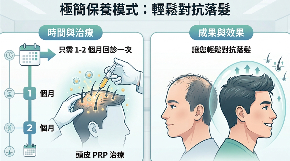 相較之下,二次離心 PRP 複合式生髮主打「全面強健頭皮微環境」 。針對忙碌的現代人,我們規劃了極簡保養模式:只需「1-2 個月回診一次頭皮 PRP 治療」即可,讓您輕鬆對抗落髮 。雄性禿受賀爾蒙影響,恢復後仍需維持,但透過巴黎國際長春診所的定期保養,能有效穩固生髮成效 。