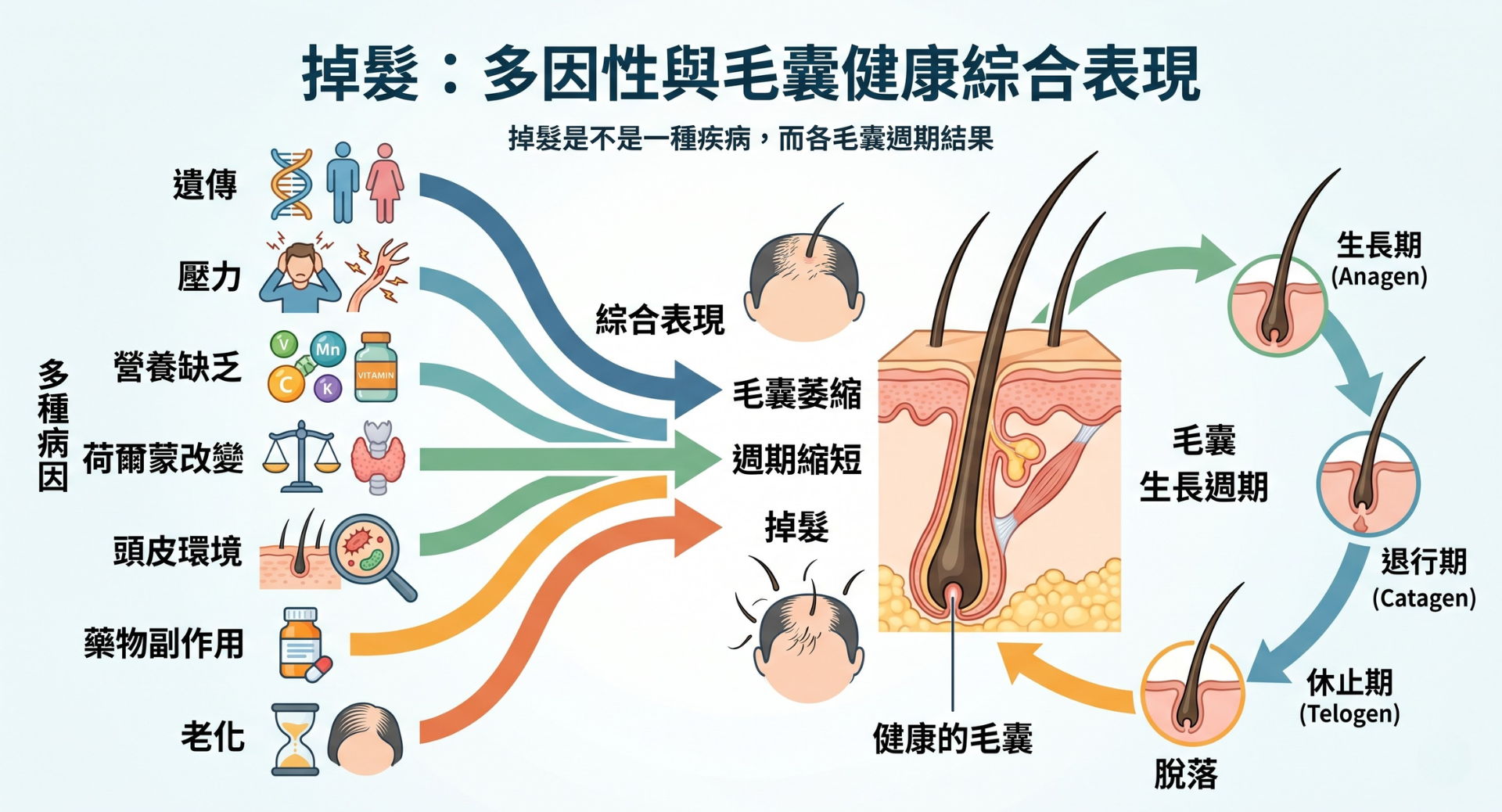 掉髮不是單一疾病,而是多種病因在毛囊週期與毛囊健康度上的綜合表現 。在臨床上,真正的關鍵不是「掉了多少根」,而是掉髮的型態與時間軸 。