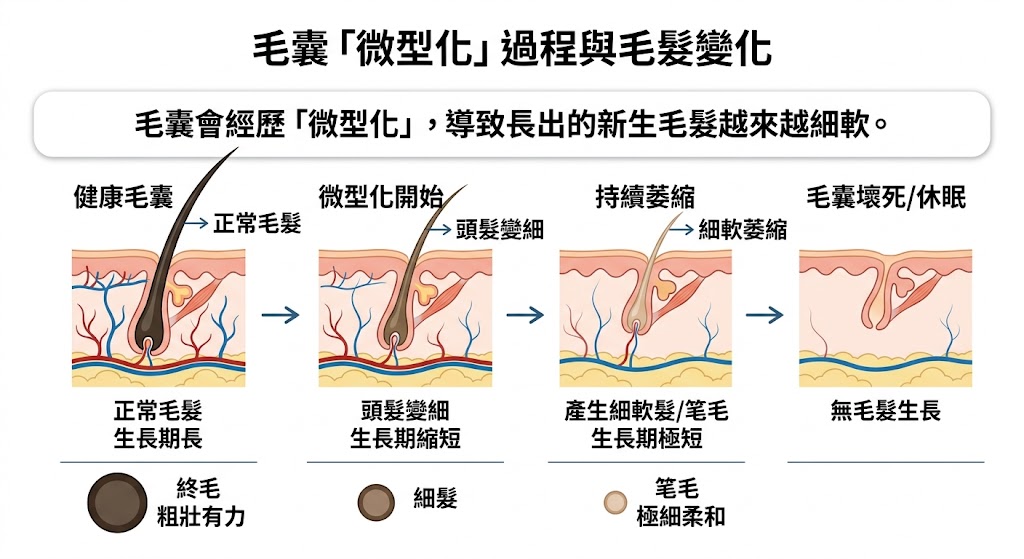 穩固髮根(延長週期): 強化毛囊周圍的血液循環與養分供給,延長毛髮的壽命。越早介入治療,挽救毛囊的機率越高。