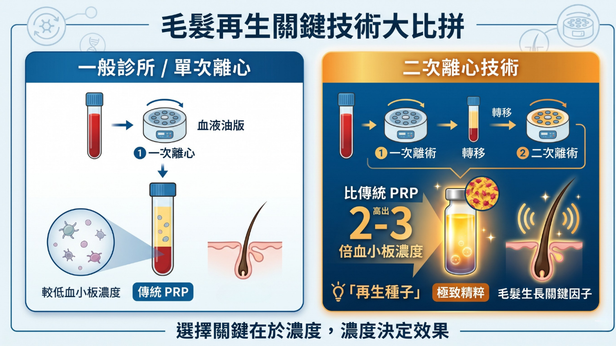 - 結論: 二次離心技術(Double-spin)能萃取出更高濃度的生長因子,其臨床生髮效果穩定度顯著優於傳統單次離心 。