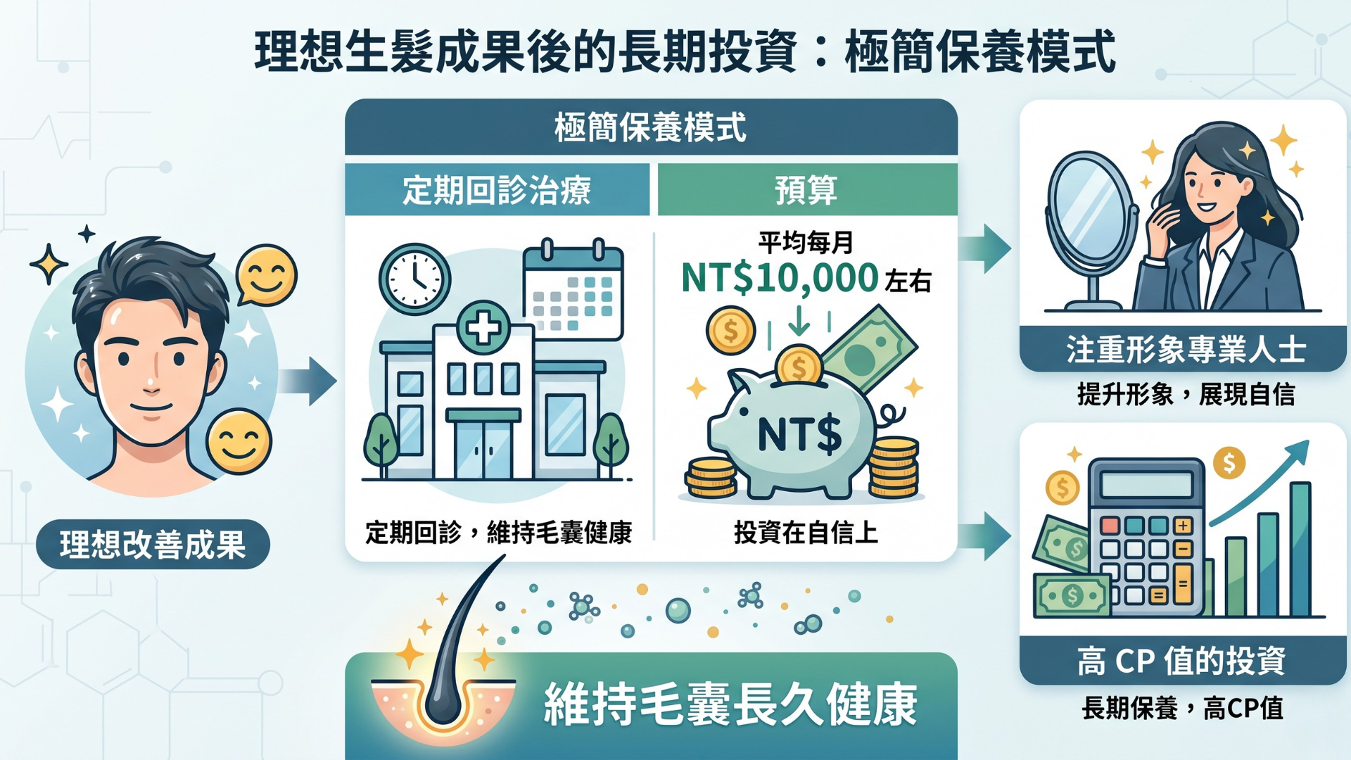 - 費用與保養:在獲得理想的改善成果後,為了維持毛囊的長久健康,醫師建議進入極簡保養模式。以平均每月一萬元左右的預算進行規律保養(定期回診治療),且不會收取額外費用,是許多注重形象的專業人士心目中高 CP 值的投資。