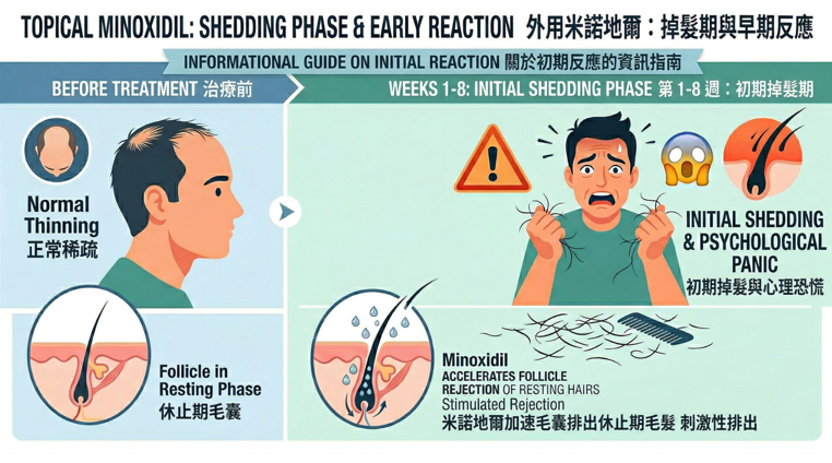 - 換毛期掉髮: 治療前 8 週可能出現短期的「換毛期掉髮」,這常令患者感到極大的恐慌。