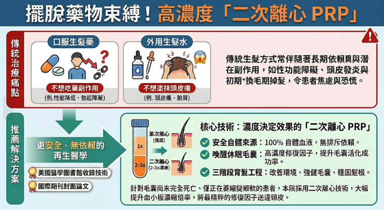 面對「一直掉頭髮怎麼辦」的困擾,許多患者首先想到的就是尋求生髮藥物的協助 。然而,吃生髮藥副作用與塗生髮水頭皮癢的問題,卻常常讓患者陷入兩難。今天我們將深入探討常見生髮藥物的真實效果與限制,並為您介紹由巴黎國際長春診所與鄧翔駿醫師推廣的二次離心Prp技術,幫助您釐清迷思,找到不依賴長期服藥的生髮新選擇。