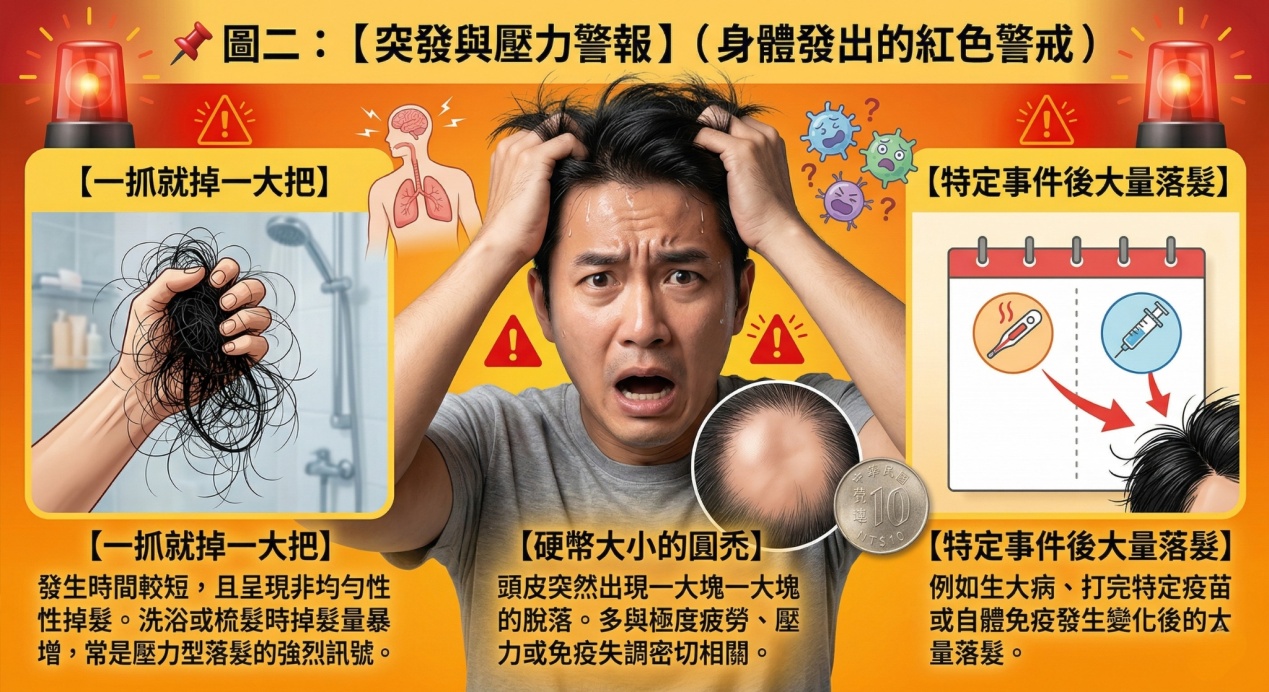 - 特定事件後大量落髮: 例如生大病、打完特定疫苗或自體免疫發生變化後的大量落髮 。