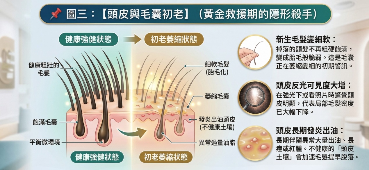 - 新生毛髮變細軟: 掉落的頭髮不再粗硬飽滿,變成胎毛般脆弱。這是毛囊正在萎縮變細的初期警訊。