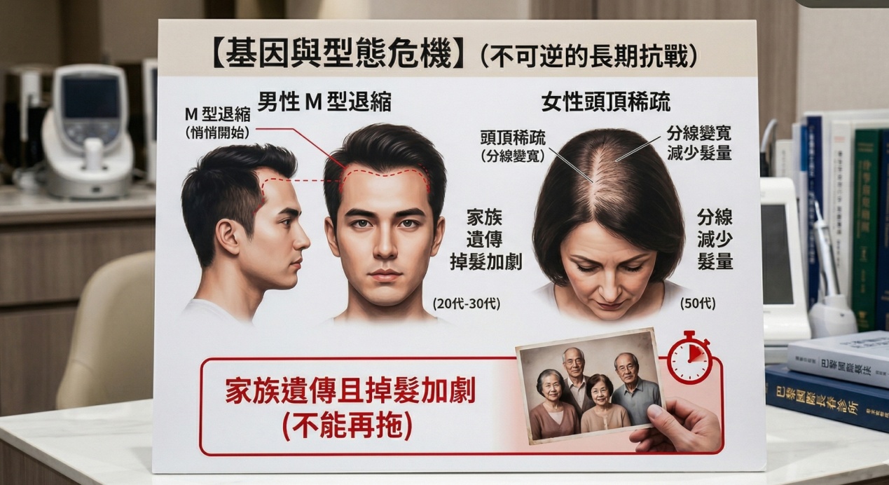 - 家族遺傳且掉髮加劇: 雄性禿是最常見原因,發生機率 90% 以上 。長輩有落髮問題且自身掉髮異常加快。
