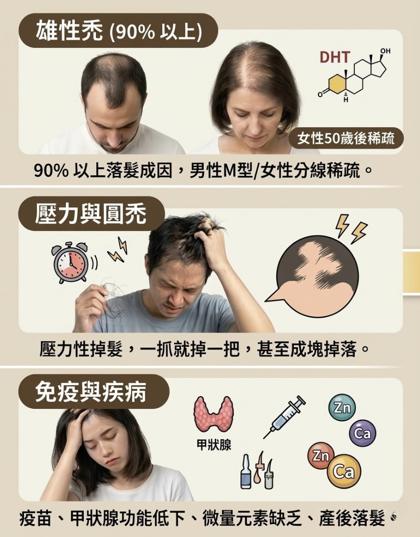 - 免疫與疾病因素: 如打完疫苗後的掉髮、甲狀腺功能低下,或體內缺乏鋅、鈣等關鍵微量元素。