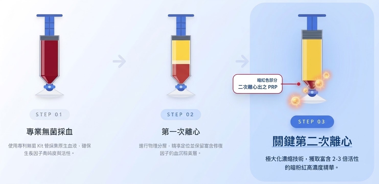 二次離心 PRP 複合式生髮: 核心目標是讓原有萎縮的毛囊再生,從根本上增加毛髮總數 。