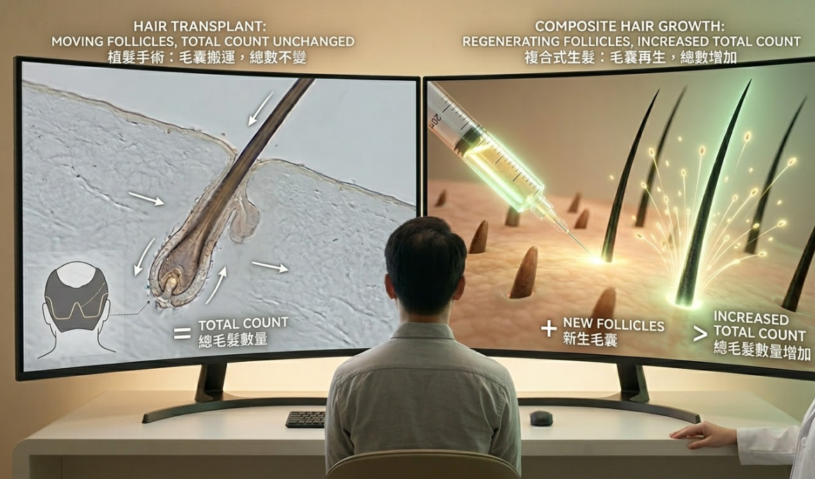 面對掉髮,許多人會優先考慮植髮,但這兩者有本質上的差異:傳統植髮: 植髮的原理是「移動位置」,將後腦勺的毛囊移至缺髮處,但頭部的頭髮總量並未增加 。此外,植髮後若不保養,原生髮仍會受賀爾蒙影響而持續掉落 。