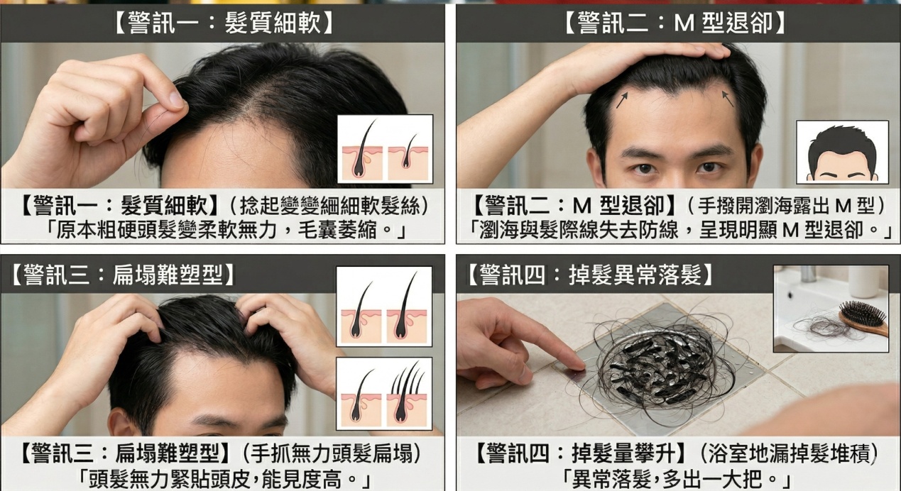 雄性禿的發生往往是漸進式的 。許多患者在初期常會誤以為只是「最近太累」或「換季掉髮」,從而錯失了挽救毛囊的黃金時機。事實上,當您的頭皮出現以下 4 大徵兆時,就是毛囊正在發出的無聲求救訊號:- 警訊一:髮質悄悄改變,粗硬髮變成「細軟髮」 這是最容易被忽略的初期徵兆。雄性禿會讓毛囊逐漸萎縮,導致新生長出來的頭髮直徑變小、變細。如果您發現原本粗硬的頭髮開始變得柔軟無力,這其實是毛囊生命力正在衰退的證據。