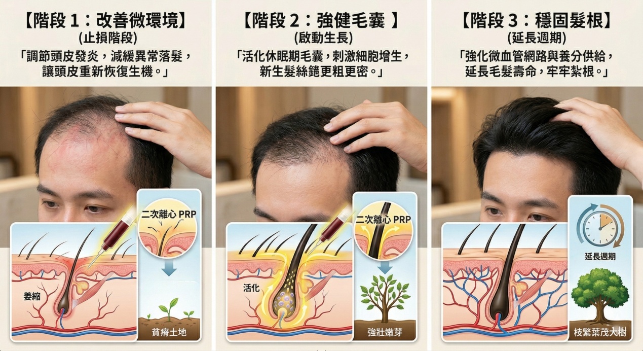 我們的目標不是挖東牆補西牆,而是讓原有萎縮的毛囊再生,從根本增加頭髮總數 。生髮是一場需要耐心的頭皮抗老投資,療程遵循著嚴謹的「三階段育髮理論」:
