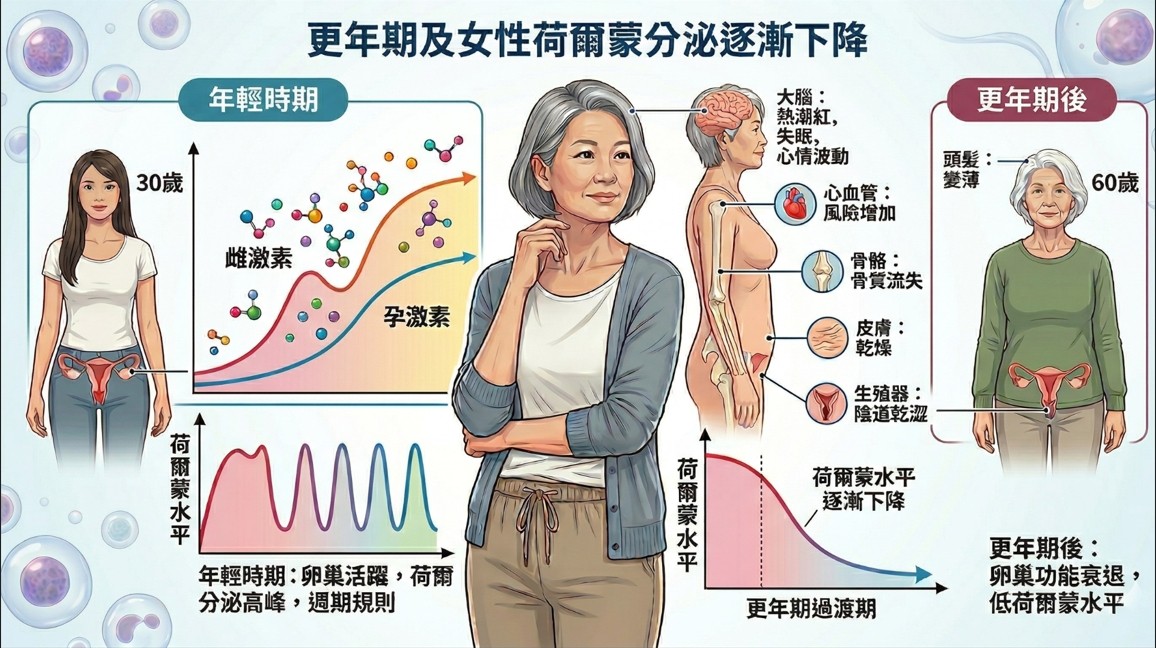 落髮的成因多樣,正確的醫學診斷是啟動有效治療的第一步 。針對熟齡女性,我們需要從更深層的生理機制來探討。1. 更年期生理劇變:女性荷爾蒙與「雄性禿」的關聯