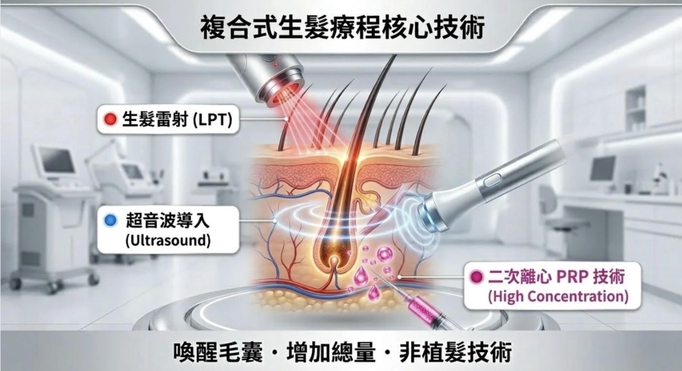 確認自體富血小板血漿(PRP)能顯著增加毛囊數量、頭髮厚度及生長密度,患者滿意度極高,免除了傳統手術負擔 。